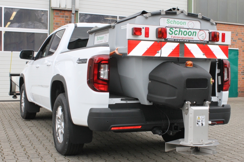 Abhängig von der Nutzlast und Ladeflächengröße wird auf der Ladefläche mittels Zurrgurten ein Schoon Streugerät angebracht. Dabei stehen sieben Streugeräte Typ »Omega« zur Auswahl. Diese reichen von 110-Liter-Behältervolumen, optimal für Kastenwagen geeignet, bis hin zu 1600-Liter-Behältervolumen. Die Streuer sind wahlweise mit GPS-Unterstützung, geschwindigkeitsabhängiger Mengenregulierung und modernster Steuertechnik erhältlich. Die Ausbringmenge zur Verteilung von Salz, Granulat, Sandgemisch und Splitt kann bequem über ein Bedienteil vom Fahrersitz aus stufenlos eingestellt werden. Die Streugeräte sind aus Kunststoff und Edelstahlteilen gefertigt und somit optimal für den Winter angepasst.