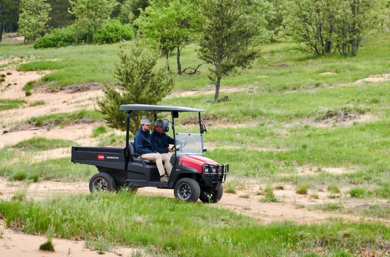 Schmale Bauweise und beinahe lautloser Antrieb: Der »Workman GTX-E« kommt traditionell auf Campingplätzen zum Einsatz. Nutzbar ist er ebenso im innerstädtischen Bereich. Dort kann er zudem als Stromquelle für Lautsprecher und Beleuchtung verwendet werden.