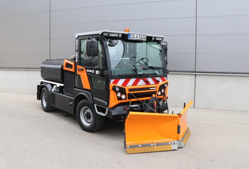 Der neue »Boki H170« kombiniert dabei hohe Flexibilität im Ganzjahreseinsatz mit optimalem Fahrkomfort und einem ebenso einfachen wie übersichtlichen Bedienkonzept. Optimal geeignet für den Kommunaleinsatz ist der neue »Boki H170« auch aufgrund seiner Breite von 1700 mm, die das Fahrzeug in Kombination mit der Allradlenkung extrem wendig macht. Verfügbar sind zwei Radstände mit 2400 bzw. 2900 mm. Die modulare Arbeitshydraulik des neuen »Boki H170« lässt sich individuell auf die Kundenbedürfnisse abstimmen und kann problemlos abgeändert oder erweitert werden. Dank seines Frontgeräte-Schnellwechselsystems lässt sich der Kommunaltransporter in Minutenschnelle zu einem Kehrsaug- oder mit angeflanschter Fräse zum Räumfahrzeug umfunktionieren. Zwischen 3,5 und 7,5 t liegt das zulässige Gesamtgewicht der Fahrzeuge.