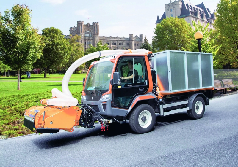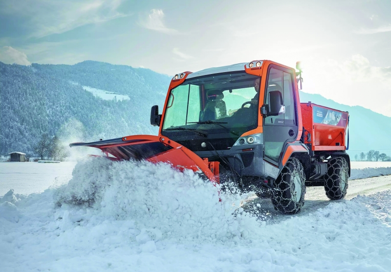 Eine Besonderheit des Kommunaltransporters »Unitrac« sind die 4-Rad Lenkung und eine ausgezeichnete Zugkraft – hier in einem typischen Kommunaleinsatz (Bild: Lindner).