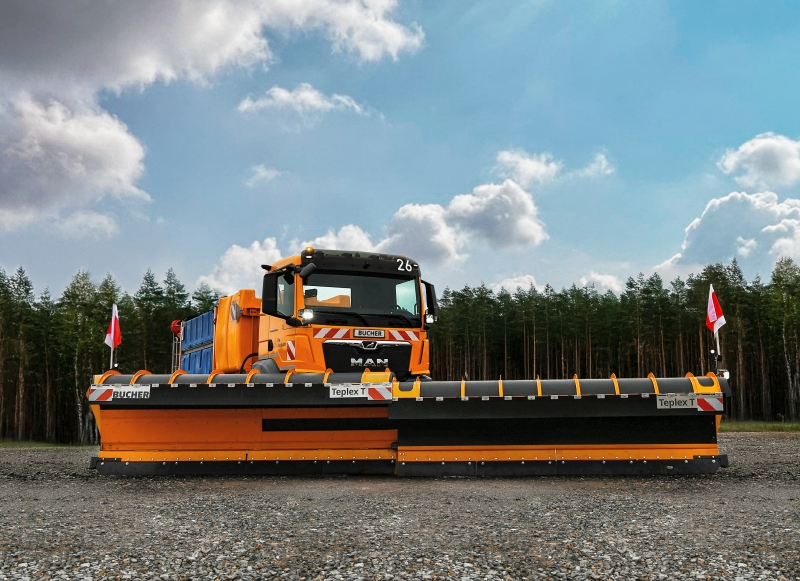 Die Teleskoppflüge der Baureihe »Teplex« überzeugen vor allem durch ihre Breitenvielfalt und die stufenlos verstellbare Ausschublänge der Schare, die entweder links und/oder rechts auch während der Fahrt ausfahrbar sind. Je nach Einsatzbedarf und den benötigten Räumbreiten kann zwischen zwei unterschiedlichen Baureihen gewählt werden: den einfach oder zweifach teleskopierbaren Pflügen. Als Räumleisten stehen hier die patentierte Neopren- oder eine Stahl-, Kunststoff- oder Kombiräumleiste zur Verfügung. Die Serie »TE90S« gehört zur Kategorie der einfach teleskopierbaren Schneepflüge und verfügt über eine Pflugbreite von maximal 5170 mm, wohingegen die zweifach teleskopierbaren Räumgeräte der Baureihe »TE90X« eine Pflugbreite von 7000 mm vorweisen können. Als größter teleskopierbarer Frontschneepflug auf dem Markt bietet der neue zweischarige »Teplex TK4080X« mit einer variablen Arbeitsbreite von bis zu 8000 mm eine hochflexible und leistungsstarke Lösung für maximale Effizienz im Einsatz. Der Bedarf an zusätzlichen Räumfahrzeugen oder kostenintensiven Seitenpflug-Kombinationen entfällt. Gesteuert wird der »Teplex TK4080X« vom Fahrer selbst – ein Beifahrer ist nicht erforderlich. Gerade auf Bundesstraßen und Autobahnen können die variablen Teleskoppflüge ihre Vorteile voll ausspielen. Eine dreispurige Autobahn kann von zwei Fahrzeugen mit je einem Mann Besatzung problemlos von Schnee befreit werden.