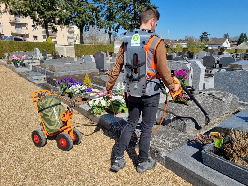 Friedhöfe sind ein sehr geeignetes Einsatzfeld für die Heißluftlanze am Rückentragegestell und mit dem Transportwagen (Bild: SEFMAT Groupe).