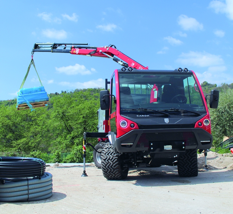 Der Caron »CTS« bei der Arbeit: Der optionale Kran kann an in der Zentral- oder Heckposition, auf einer absetzbaren Pritsche oder auf einem verstärkten Rahmen montiert werden (Bild: Caron).