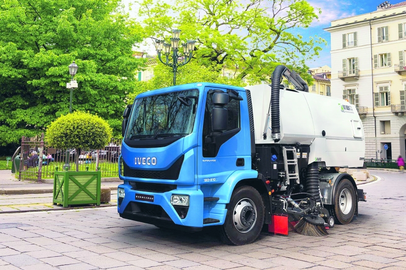 In der 15t-Klasse ist der IVECO »EuroCargo« zu Hause. In ihrer Vielzahl von möglichen Alternativen bis 320 PS sind diese Fahrzeuge sehr häufig als Arbeitsgeräte, z. B. Kehrmaschine oder Krankipper, im Einsatz. Der »EuroCargo« ist das perfekte Nutzfahrzeug für alle innerstädtischen Einsätze und kommunalen Anwendungen – dank der geringen Fahrerhausbreite (2,1 m), dem großen Einschlagwinkel (52 Grad) und einem hervorragenden Wendekreis in seiner Klasse (unter 11 m bei Radstand 2790 mm). Mit einem permanenten Allradantrieb, einer Gesamtmasse von 11,5 und 15 t sowie vier Radständen zwischen 3240 und 4150 mm, unterschiedlichen Fahrerhäusern, umfangreichen Individualausstattungen und Versionen mit Einzel- oder Zwillingsbereifung an der Hinterachse eignet er sich für eine Vielzahl an Aufbauten und Einsätzen. Die Tector-5- bzw. 7-Motoren sind in Leistungsvarianten zwischen 160 und 320 PS in Kombination mit den 6-Gang-Schaltgetrieben oder mit dem vollautomatischen Allison-Automatikgetriebe verfügbar. Optional steht der »EuroCargo« mit einer breiten Auswahl an getriebeseitigen Nebenabtrieben zur Verfügung.