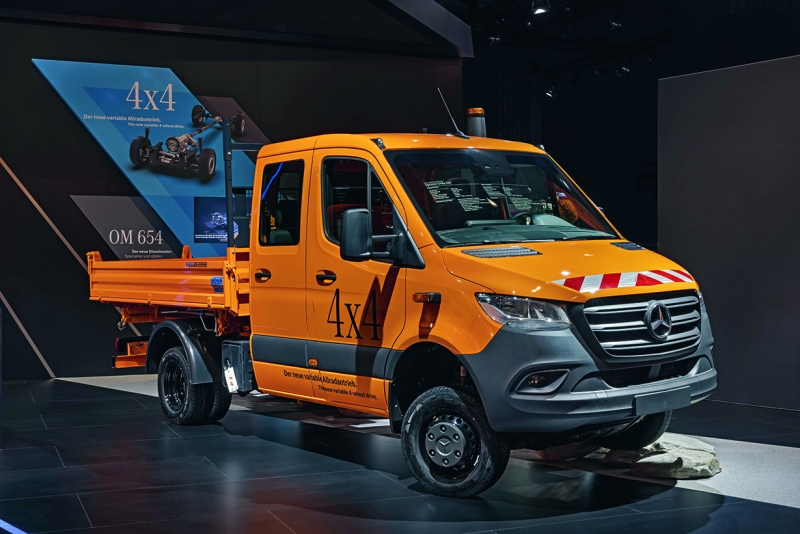 Der »Sprinter« gibt einer ganzen Fahrzeugklasse den Namen: die »Sprinterklasse«. Im vergangenen Jahr feierte der Transporter sein 30-jähriges Jubiläum. Ein Ende ist nicht in Sicht, allerdings geht es elektrisch weiter, denn längst gehört auch ein »Sprinter« zum Portfolio. Lieferbar als Kastenwagen bzw. Pritschenmodell und mit inzwischen drei Batterien zur Auswahl – die maximale Leistung beträgt 150 kW. Die Eigenschaften der Verbrenner- und E-Variante sind ähnlich. Das Antriebskonzept von Heck- und Allradantrieb wird im »Sprinter« um einen Vorderradantrieb ergänzt. Bei dieser Version steigt konstruktionsbedingt die Nutzlast um 50 kg gegenüber dem Heckantrieb; eine 80 mm niedrigere Ladekante macht das Be- und Entladen oder das Ein- und Aussteigen deutlich komfortabler.