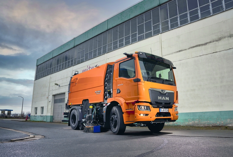 Eine sehr kompakte Kombination stellt die Kehrmaschine aus »TGM 18.320« und »Faun Viajet 6«-Aufbau dar (Bild: MAN).