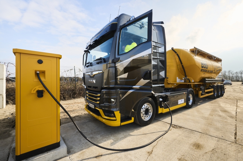 Ein MAN »eTGX« mit Sattelauflieger beim Stromtanken (Bild: MAN).