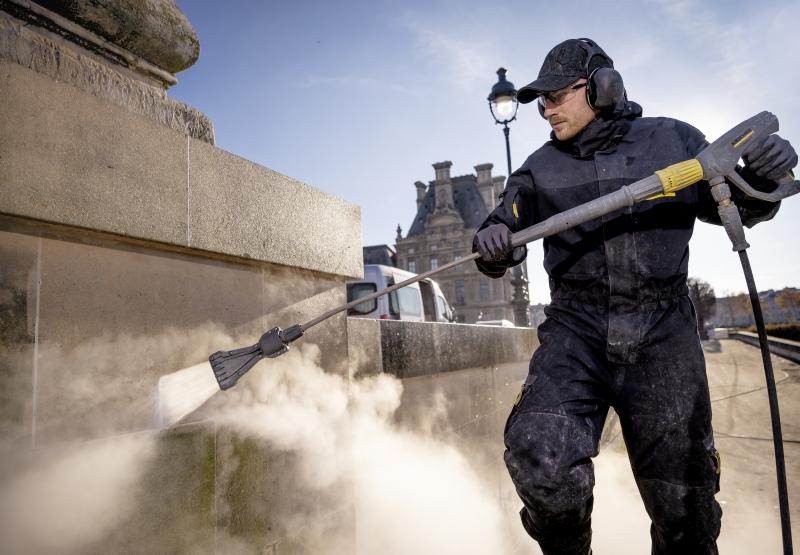 Mit der neuen Düse lassen sich leichte bis mittelschwere Verschmutzungen selbst von empfindlichen Oberflächen entfernen, beispielsweise in der Fassadenreinigung oder bei der Reinigung von Mauern und Denkmälern (Bild: Kärcher).